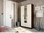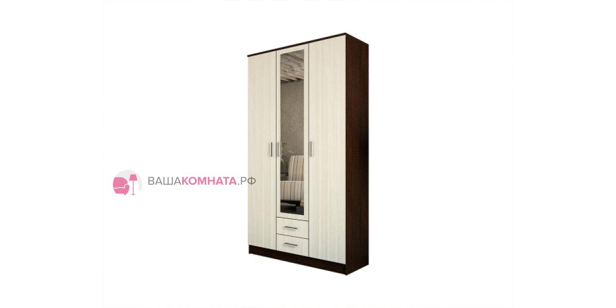 Это трехстворчатая модель, в центре которой расположено большое зеркало, а внизу находятся два выдвижных ящика.