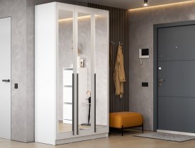 За двумя дверьми находится широкая штанга для вешалок-плечиков с верхней одеждой, деловыми костюмами, красивыми платьями и другой одеждой. Полки, скрытые за боковой дверью, пригодятся для сложенной одежды, постельного и нижнего белья, разнообразных аксессуаров и коробок с обувью.