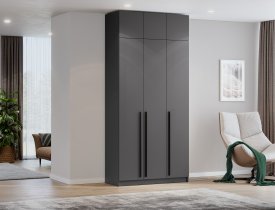 За двумя дверьми находится широкая штанга для вешалок-плечиков с верхней одеждой, деловыми костюмами, красивыми платьями и другой одеждой. Полки, скрытые за боковой дверью, пригодятся для сложенной одежды, постельного и нижнего белья, разнообразных аксессуаров и коробок с обувью.